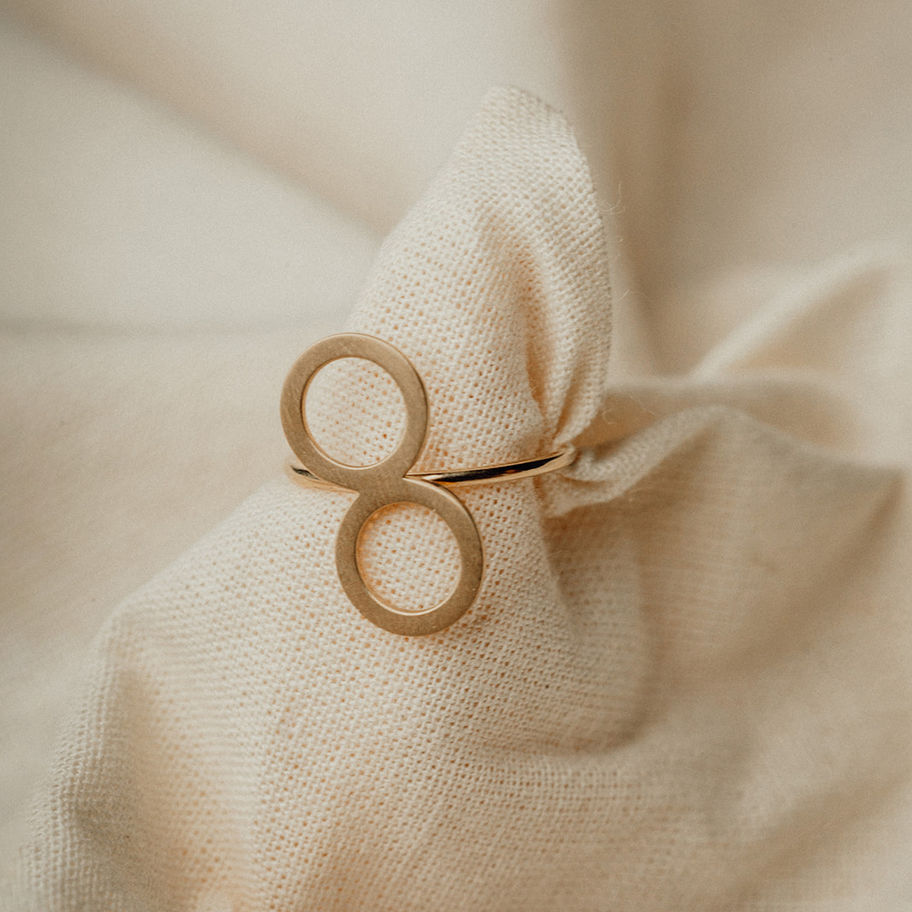 Anel produzido em ouro amarelo 18k de reuso com dois círculos não lineares em acabamento fosco e aro com acabamento polido. Peça pode ser produzida na versão lisa; na versão com um círculo cravejado com 8 diamantes 0.5pts lab grown; ou os dois círculos cravejados com 16 diamantes 0.5pts lab grown.