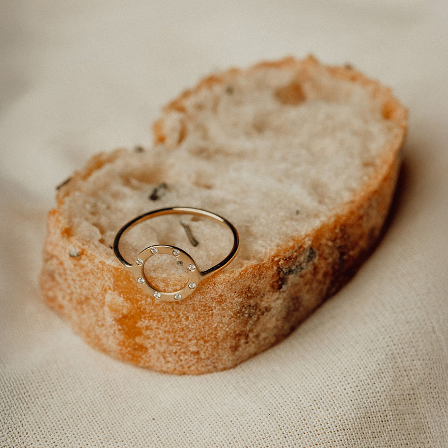 Anel produzido em ouro amarelo 18k de reuso com um círculo em acabamento fosco e aro fino com acabamento polido. Peça pode ser produzida na versão lisa e na versão cravejada com 8 diamantes 0.5pts lab grown.